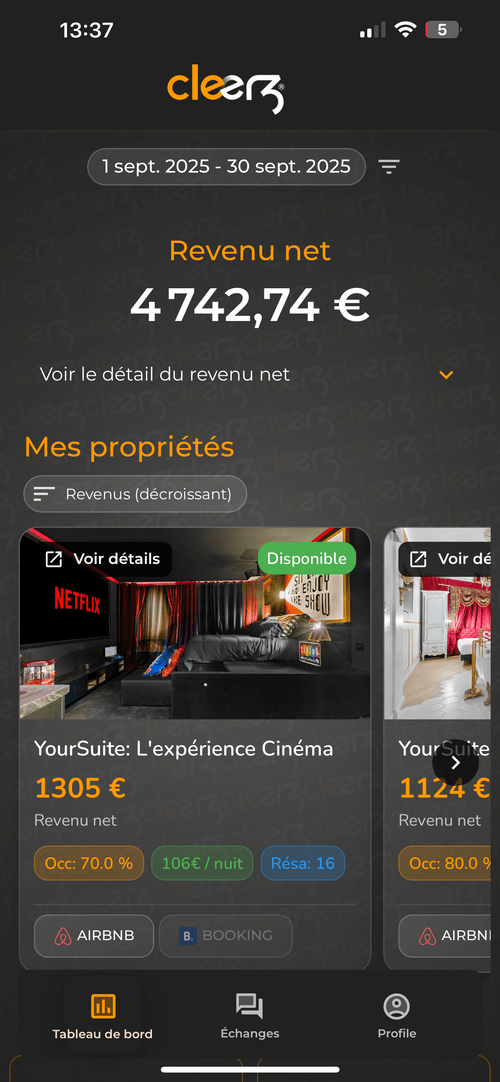 Grâce à notre application mobile, suivez en temps réel toute l’activité de votre logement, échangez avec nos équipes et consultez l’ensemble de vos métriques de performance quelle que soit la plateforme